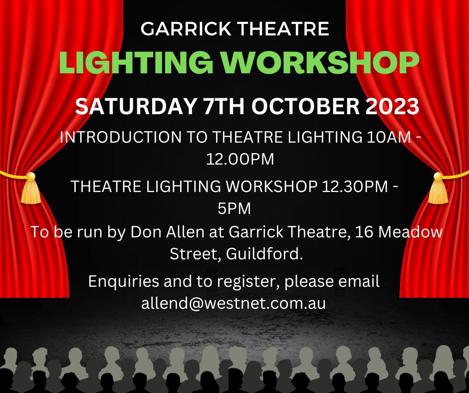 LIGHTING WORKSHOP Posted bygarricktheatrewa20th Sep 2023Posted inUncategorized Share this: Click to share on X (Opens in new window) X Click to share on Facebook (Opens in new window) Facebook Like Loading... Related